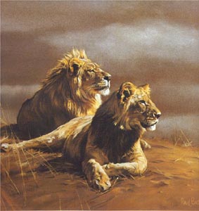 Richtig, zwei Prachtburschen von männlichen Löwen, etwa 15 Meter entfernt. Meine Reaktion war einfach grossartig. Mit sagenhafter Geschwindigkeit war ich in meinem Bus und Tür zu.