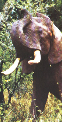 Anmerkung: Die Elefanten im Hluhluwe-Umfolozi sind oft sehr aggresiv. Der Grund hierfür liegt daran, dass erst in den 1980igern Jahren diese wieder hier eingeführt wurden. die Bestände kamen von Herden die im Krüger gekallt wuden. Lediglich die Jungtiere wurden eingefangen und verlagert. Ein Elefant vergisst nicht und darüberhinaus wuchsen diese Bestände ohne die Erziehung alter Elefantenbullen und Matronen heran. Das Ergebnis, oft unkontrollierter Zorn. Man hat vor einigen Jahren ältere Bullen eingesetzt und eine Verbesserung hat bereits stattgefunden. Trotzdem mussten zu meinem Bedauern am 12. Juli 2004 drei junge Bullen erschossen werden, die einen Ranger und 3 Nashörner töteten.