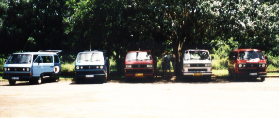 Dies waren die Fahrzeuge von Crackerjack Safaris. Der rote Bus auf der rechten Seite ist Peter's der auch heute noch Safaris durchführt. Zu ihm etwas mehr zu einem späteren Zeitpunkt. Der blaue, zweiter von links ist auch heute noch in meinem Besitz und liebevoll Ashley genannt. Zu erwähnen währe vielleicht, dass die VW Busse in Südafrika alle mit 5Zylinder Audi Motoren ausgerüstet sind. Auf diesem Bild erwarten wir die Ankunft von Studiosus Reisen München, mit denen ich viel zusammengearbeitet habe.